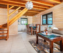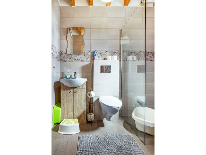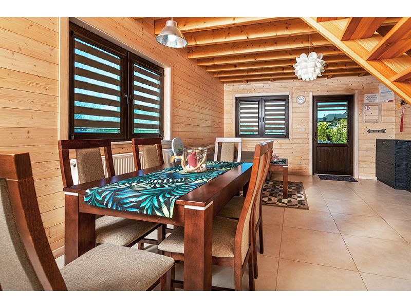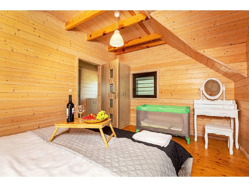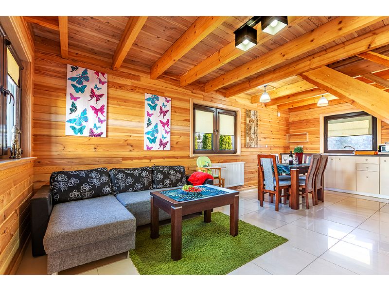 Na parterze Goście mogą spędzać czas w wygodnym salonie, w którym znajduje się podwójna rozkładana sofa, stolik,kawowy oraz stół z krzesłami. Na parterze znajduje się również łazienka oraz w pełni wyposażony aneks kuchenny. Kuchnia spełni oczekiwania nawet najbardziej wymagających Gości: wyposażona jest w chłodziarkę, kuchenkę mikrofalową, dwupalnikową płytę grzewczą, zestaw garnków, naczyń i sztućców, a także "zestaw startowy" - płyn do mycia naczyń, gąbkę, ścierkę. Bogate wyposażenie pozwoli przyrządzić pyszny posiłek w rodzinnej atmosferze - w końcu kuchnia to serce domu, więc warto o to serce zadbać również na wyjeździe, Na piętrze przygotowaliśmy dla Ciebie dwie sypialnie dwuosobowe: jedna wyposażona w łóżko małżeńskie, druga w 2 osobne wygodne łóżka pojedyncze. Nasze domki w Jastrzębiej Górze przystosowane są dla alergików - sypialnie wyposażone są w specjalne poduszki oraz kołdry hipoalergiczne firmy Medical.
