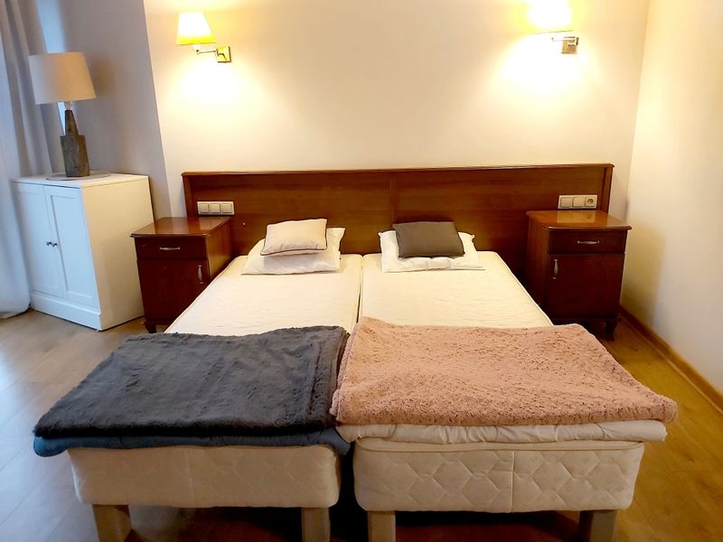 - dwa pojedyncze łóżka zestawione razem oraz jeden kanapo-tapczan